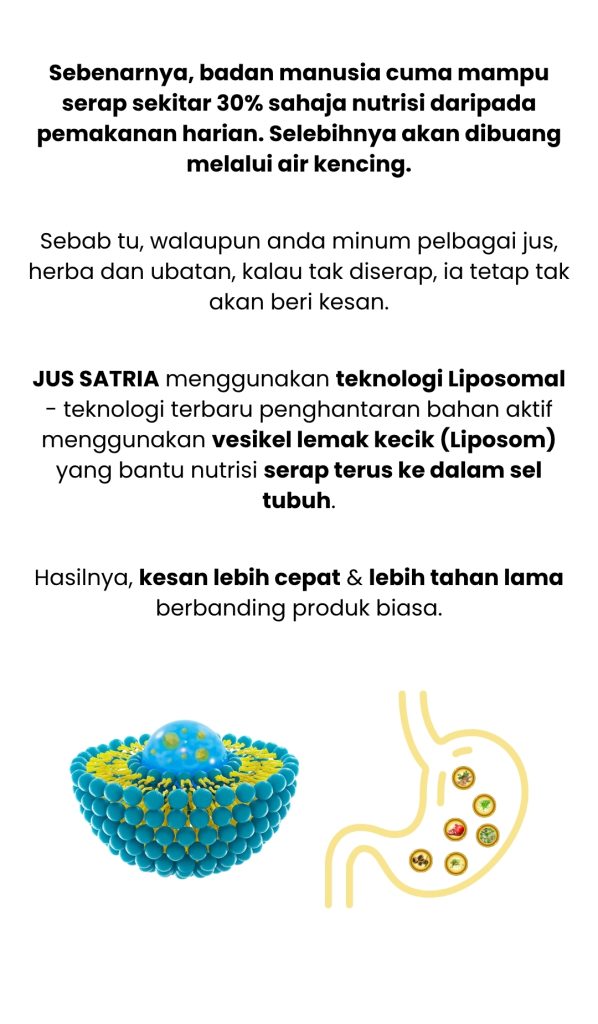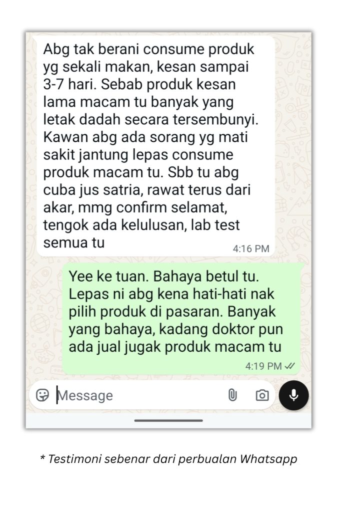 Ya, Jus Satria dihasilkan di kilang berstatus GMP yang disahkan oleh Kementerian Kesihatan Malaysia (KKM). Setiap kotak melalui proses kawalan kualiti ketat untuk memastikan ia selamat digunakan.